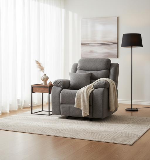 AC PacificRelax in style with the Thomas Light Gray Recliner. This comfy luxe chair adds a touch of modern charm to your living room while providing smooth r...
