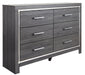 Lodanna - 6 Pc. - Dresser, Mirror, Chest, King Upholstered Panel Headboard with Bolt on Bed Frame, Nightstand - Gray