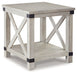 Sporting a distressed whitewash finish, this end table is rustic farmhouse living at its best. Crossbuck styling adds striking flair. Metal industrial brackets incorporate an industrial twist.