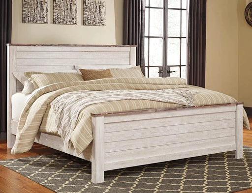 Benchcraft®Classically cozy with a chic modern twist. This queen panel bed juxtaposes farmhouse style and sleek form with a butcher block whitewash finish dra...