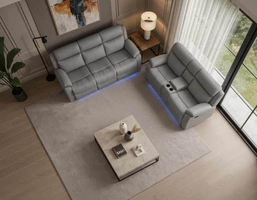 Torrent Gray Reclining Sofa and Loveseat with Cupholders, LED Lights and Speaker