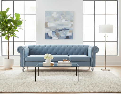 Furniture WorldThe Samir Blue Sofa delivers sophisticated comfort with its streamlined silhouette and rich blue upholstery. Engineered for both style and durabili...